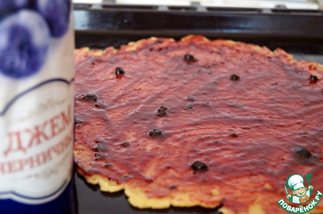 Тонко раскатываем большую часть теста. Перекладываем на противень, смазываем джемом.