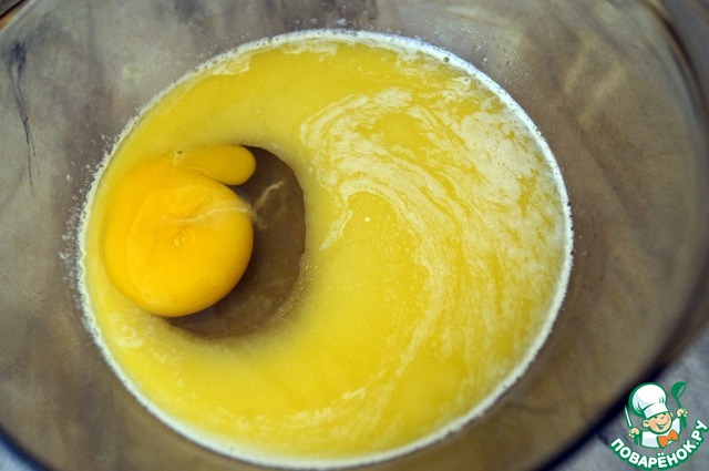Сливочное масло растопить в микроволновой печи, добавить яйцо, сахар, соль, разрыхлитель, перемешать.