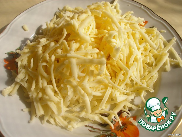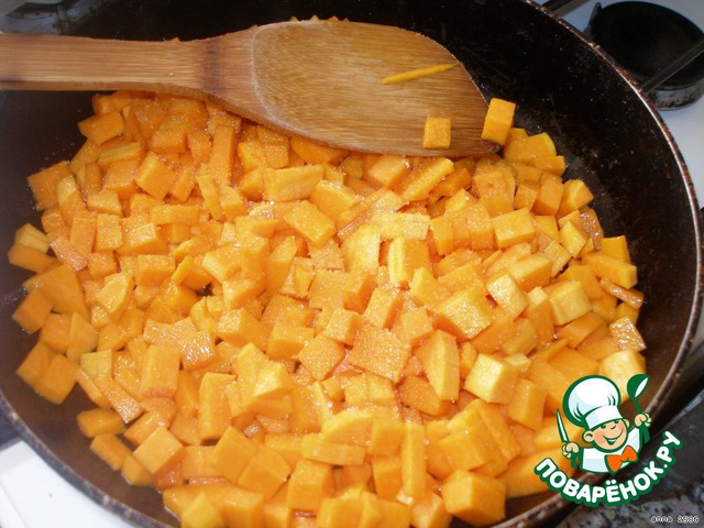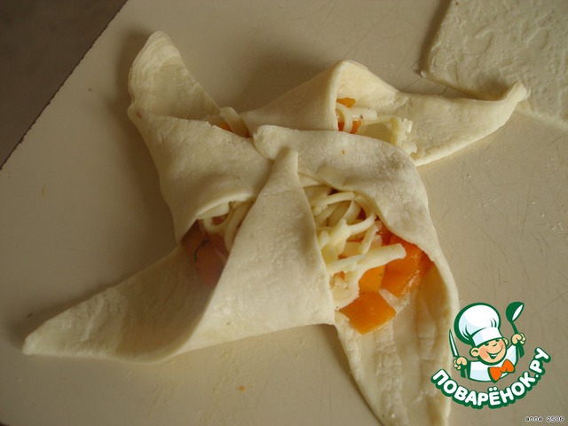 В середину подготовленных квадратов выложить по столовой ложке тушеной тыквы, присыпать тыкву сыром. Завернуть надрезанные уголки теста таким образом, чтобы начинка была закрыта.