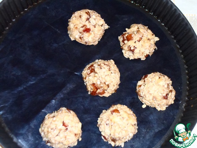 Разогрейте духовку до 180С. Застелите противень бумагой для выпечки (у меня тефлоновый лист). Слегка влажными руками формируйте из теста шарики (или при помощи ложки) и выкладывайте на противень. Выпекайте печенье примерно 20 минут до румяности.
