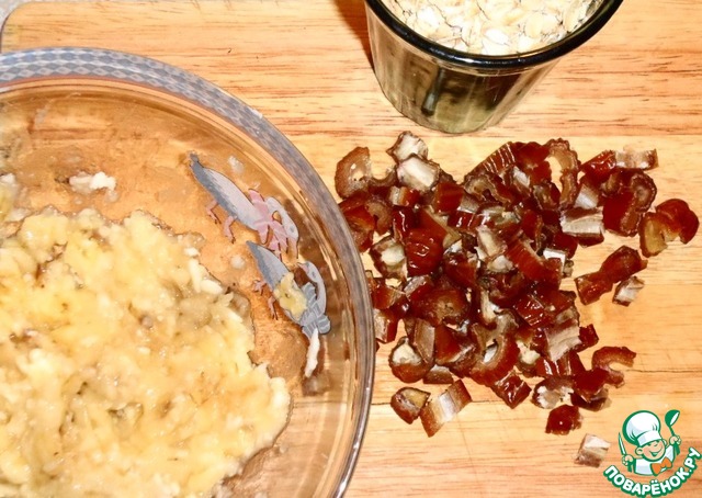 Смешайте банан, геркулес, финики и масло. Оставьте смесь на 15 минут.