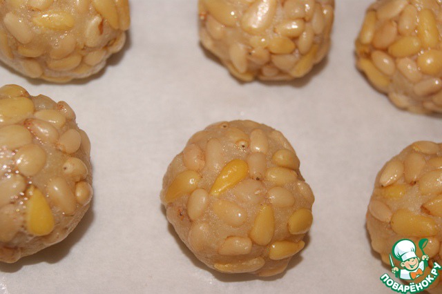 Белок взбить вилкой, приготовить тарелки с кедровыми орешками и нарезанным миндалем 40 г. Сначала окунуть печенье в белок, а затем обвалять в орешках, что кстати довольно трудно, особенно в кедровых, так что прийдется их слегка прижимать пальцами.