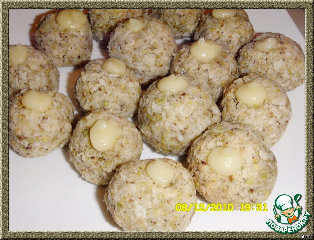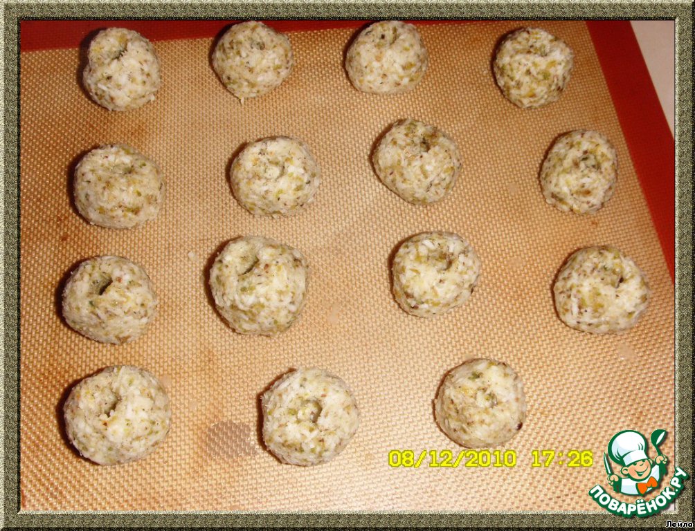 Из теста мокрыми руками сделать шарики дм 2-2,5 см. С помощью смоченной в воде ручки деревянной ложки сделать в шариках углубления.Выпекать 20-25 мин. при 150* С.