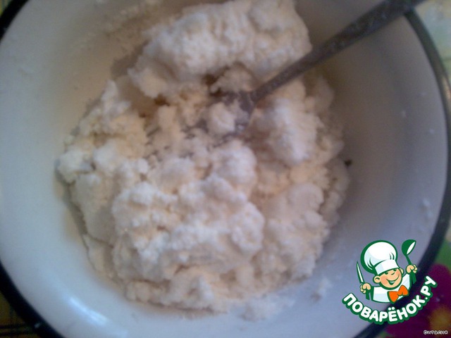 Творог размять вилкой или пропустить через мясорубку. Добавить в него оставшийся сахар, ванилин и желток.