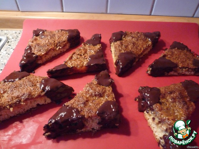 Дать немного остыть. Ещё тёплую выпечку порезать на квадраты, примерно 8х8 см. Разрезать квадраты по диагонали на треугольники.