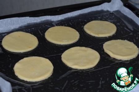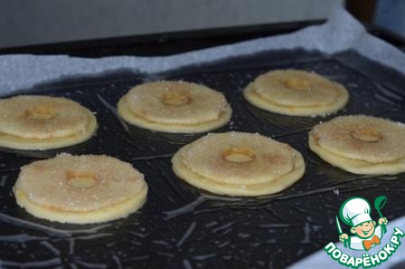 Тесто раскатать, круглой выемкой (диаметром чуть больше нарезанных яблок) вырезать низ печенья.