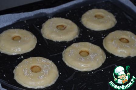 Накрыть им нижнюю часть с яблоком ( смазав по кругу выступающей части белком), придавить пальчиками, так чтобы две части хорошо соединились. смазать желтком, присыпать кунжутом или орешками, сахаром, чем больше нравится.. Поставить выпекать при температуре 170-180 градусов минут на 15. В серединку каждого печенья положить пол-ложечки соуса, снова поставить в духовку минут на 5.