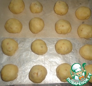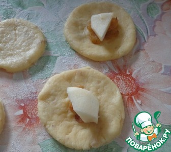 На каждый кружочек кладем немного изюма, а сверху кусочек яблока. Заворачиваем тесто к центру и защипываем. На противень печенье кладем швом вниз.