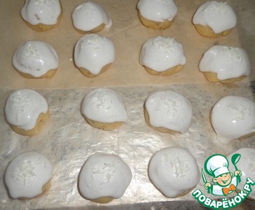 Белок взбиваем с сахаром в крепкую пену и покрываем верх печенья. Сверху посыпать кокосовой стружкой.