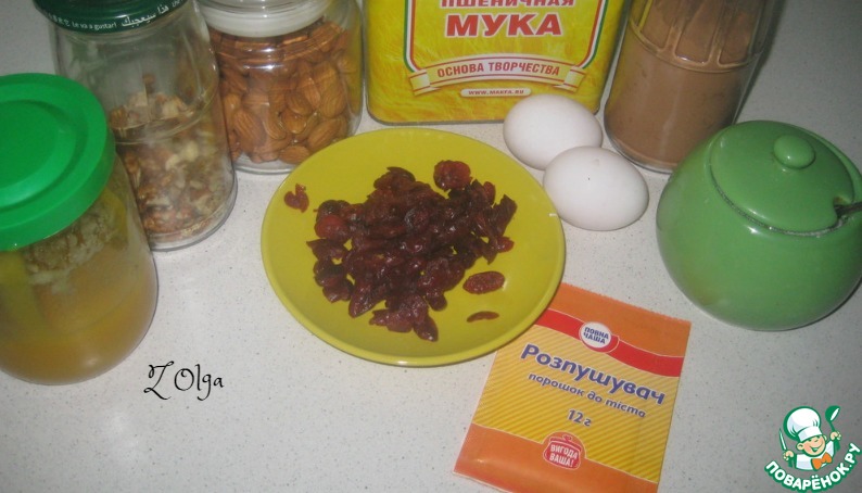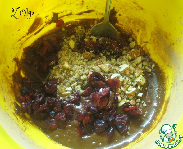 В яично-сахарно-медовую смесь добавляем половину мучной смеси, слегка измельченные орехи, клюкву. Хорошо перемешиваем. Добавляем оставшуюся муку.