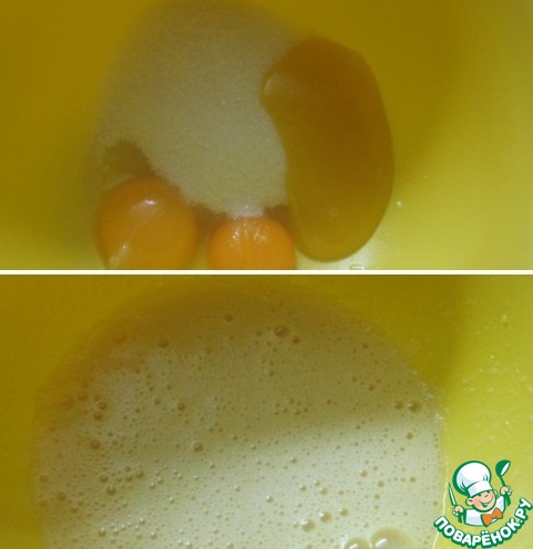 Яйца соединить в миске с сахаром и мёдом. Хорошо взбить.
