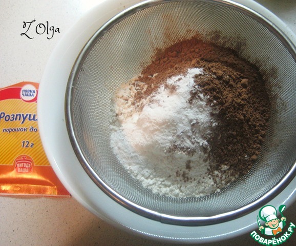В отдельную посуду просеять и смешать муку, какао и разрыхлитель теста.