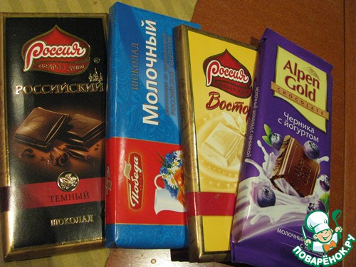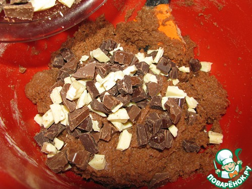 Всыпать в тесто шоколад трёх сортов и перемешать. Духовку нагреть до 180 гр. С