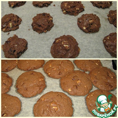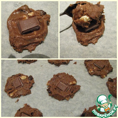 Влажными руками и чайной ложкой раскладываем равные порции теста, на каждую порцию кладём по квадратику шоколада с начинкой, а сверху ещё часть шоколадного теста. Немного приминаем и создаём круглую форму.