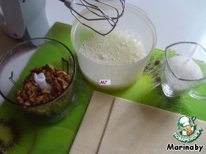 Возьмем белки, щепотку соли и начнем взбивать миксером (белки должны быть охлажденными), постепенно добавляя сахар.