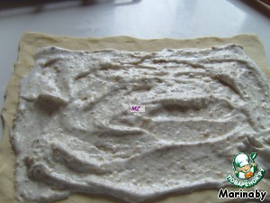 Второй пласт теста я решила сделать в виде рулета, так же смазала белково-ореховой смесью.