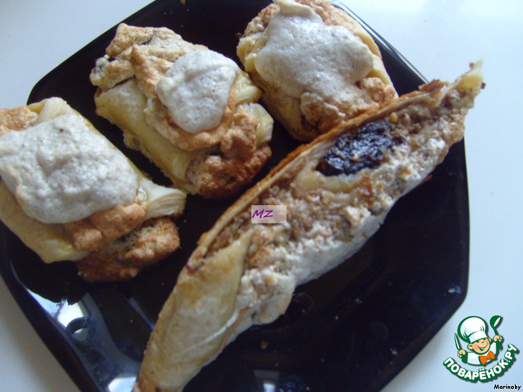 | Позвонил отец и сказал, что заедет. Сразу в голову пришло что-нибудь испечь. Для этого понадобилось минимальное количество продуктов и времени – тесто слоено-дрожжевое в морозильнике, яйца в холодильнике, и грецкие орехи, сахар и немного чернослива. Вот и родился этот рецепт на ходу. |