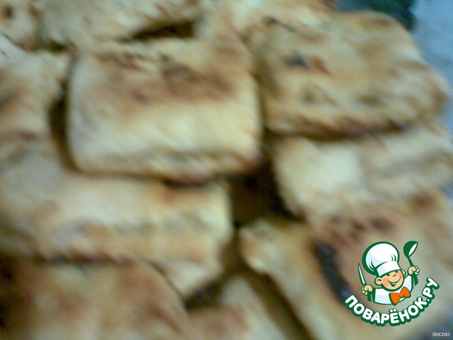Этой начинкой смазать раскатанное тесто. Затем, свернуть пополам, немного утромбовать. Разрезать на квадратики и в духовку минут на 30-40.