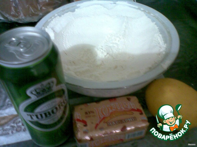 Размягченный маргарин смешать с мукой, добавить пиво. Лимон потереть на терке вместе с цедрой. 1/3 часть добавить в тесто.
