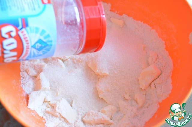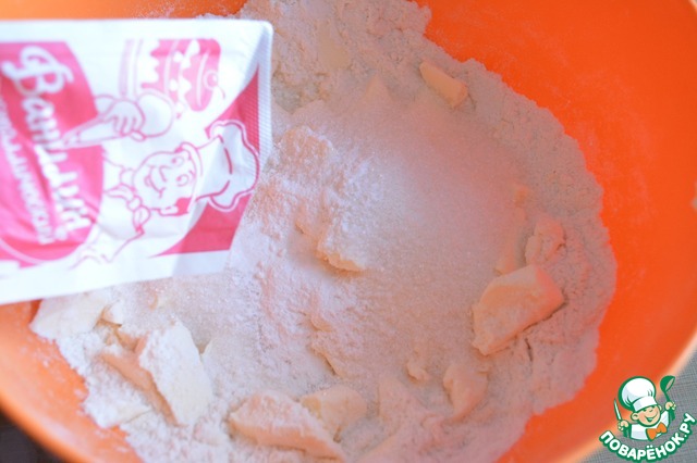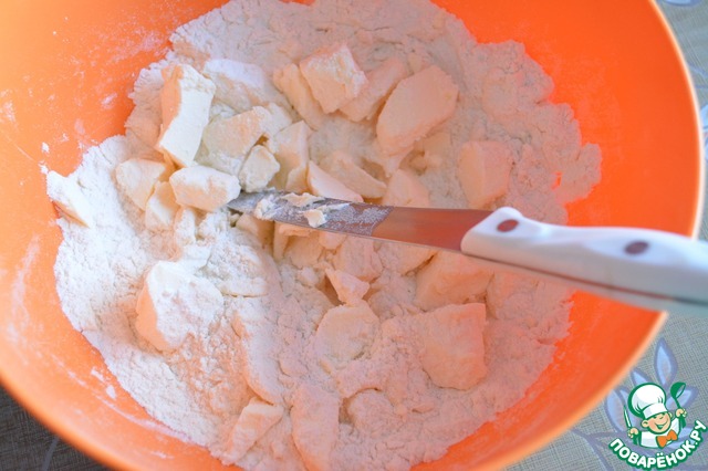 В миске просеиваем муку и добавляем сливочное масло комнатной температуры. Масло режем ножом и перемешиваем с мукой.