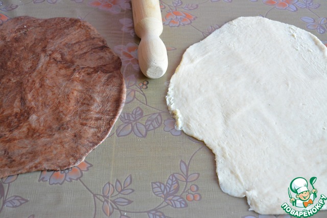 Разделяем тесто на 2 части, одну часть откладываем, а во вторую добавляем какао. Какао я рассыпала на стол и начала месить тесто в нем (как будто в муке).