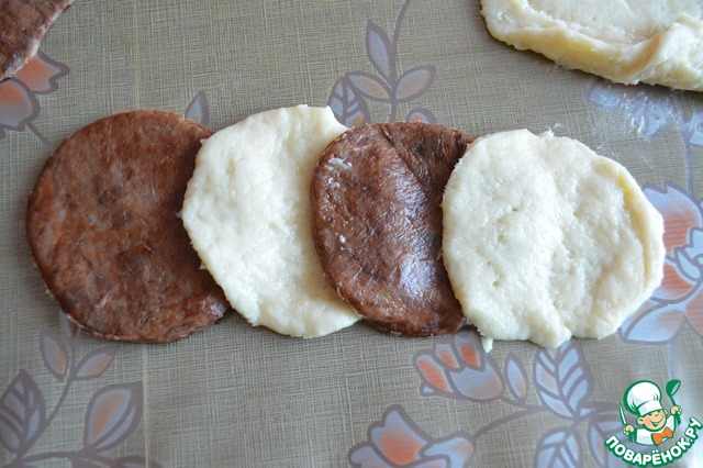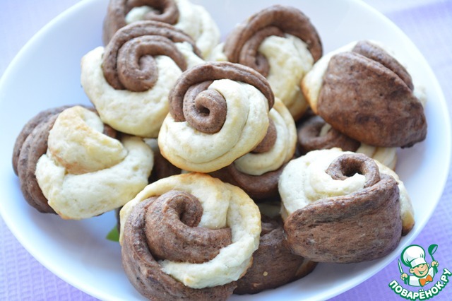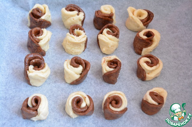 Сворачиваем рулетом, сложенные кружочки. И посередине разрезаем ножом. Получается 2 печеньки.