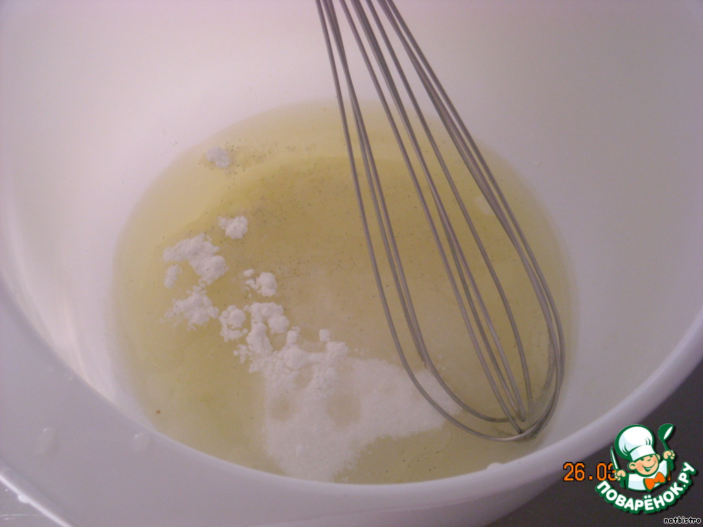 Взбить яичный белок с сахаром, ванильным сахаром, солью, лимонным соком, пока сахар не растворится полностью.