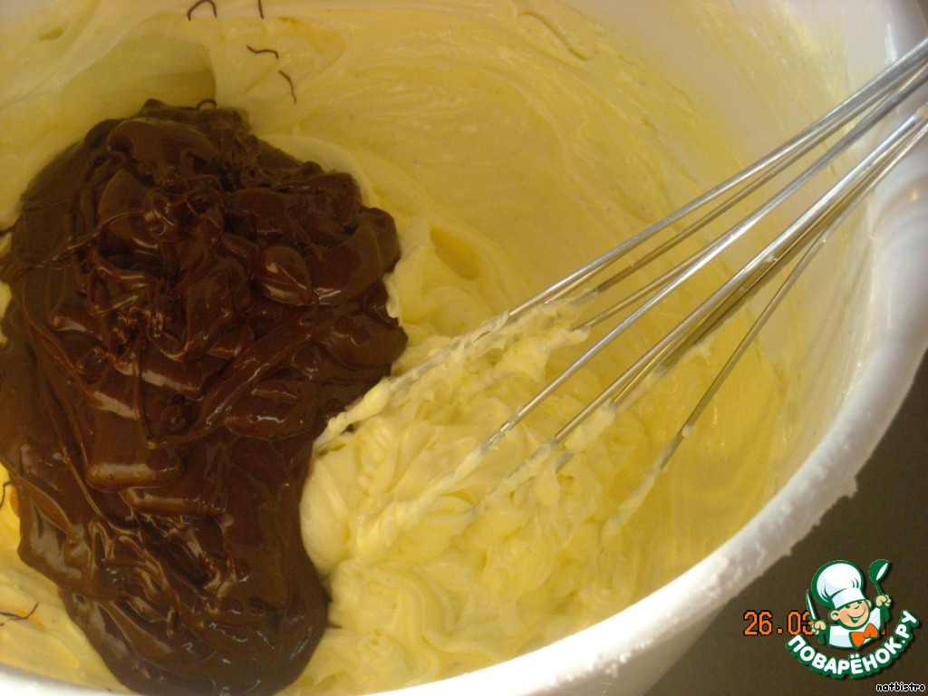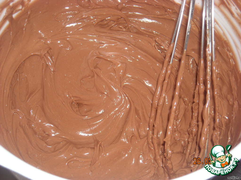Отдельно растопить 125 г горького шоколада на водяной бане, дать немного остыть и взбить его в крем.