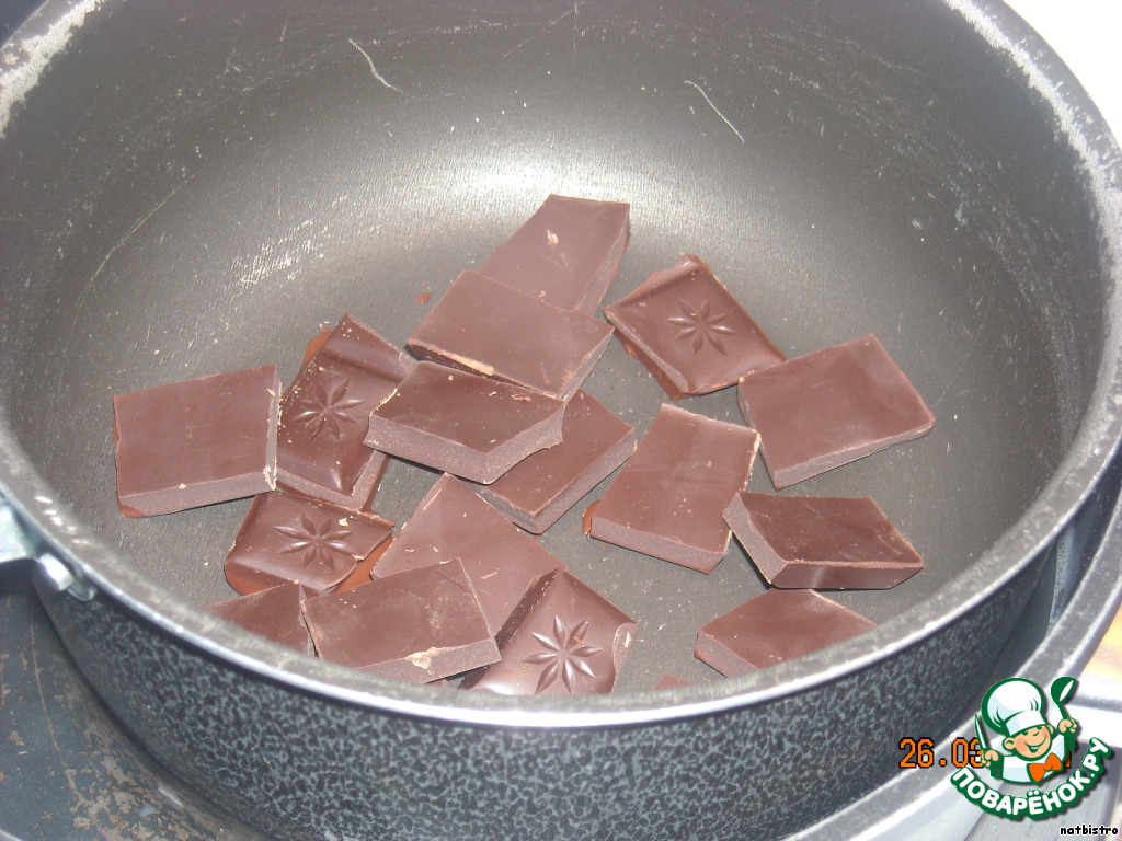 Приготовить глазурь. Растопить на водяной бане 100 г горького шоколада.
