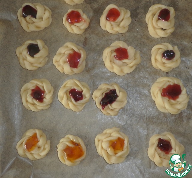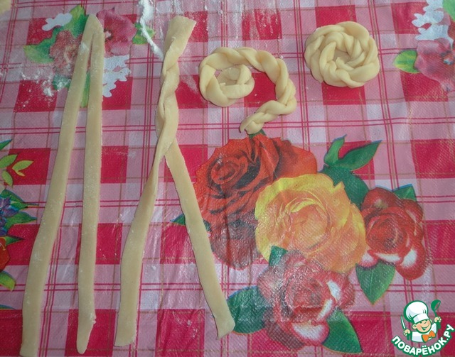 Тесто раскатать в пласт толщиной 3-4 мм. Вырезать полосочки и скрутить как показано на фото.