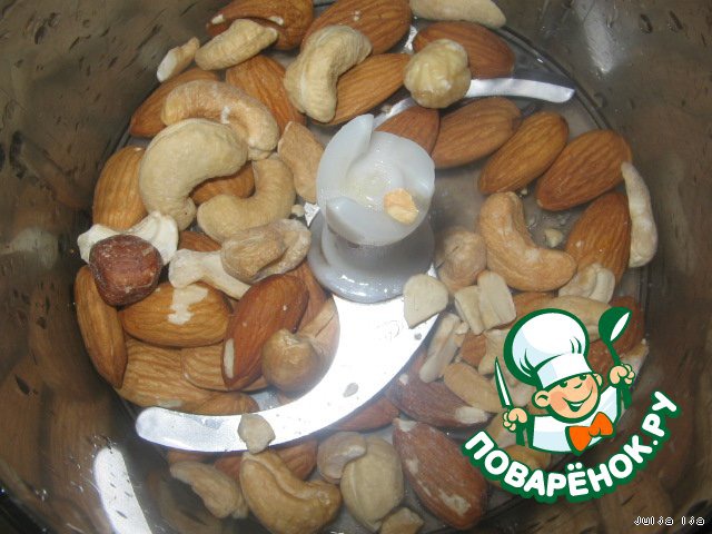 Орехи перемолоть в блендере (или пропустить через мясорубку).