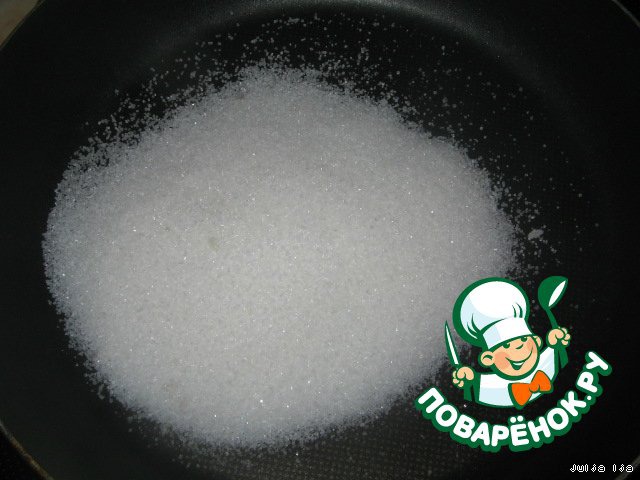 Варим карамель. На сухую сковороду насыпаем оставшийся сахар и на среднем огне, помешивая его, ждём, пока образуется карамель. Происходит это быстро, главное, помешивать, чтобы тепло распределялось равномернее.