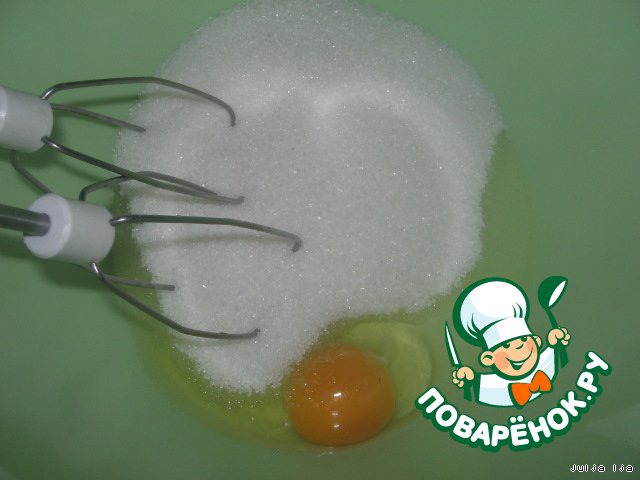 Яйцо растереть с сахаром (125 г) и щепоткой соли.