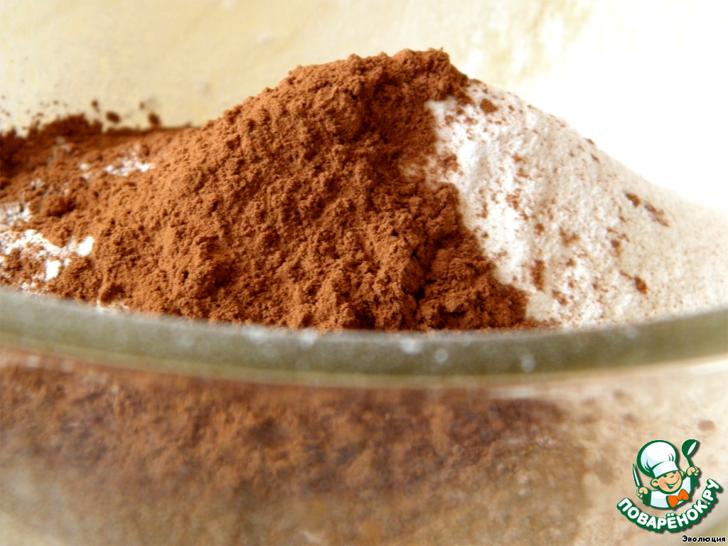 В чашку просеиваем муку и разрыхлитель, добавить соль и какао-порошок.