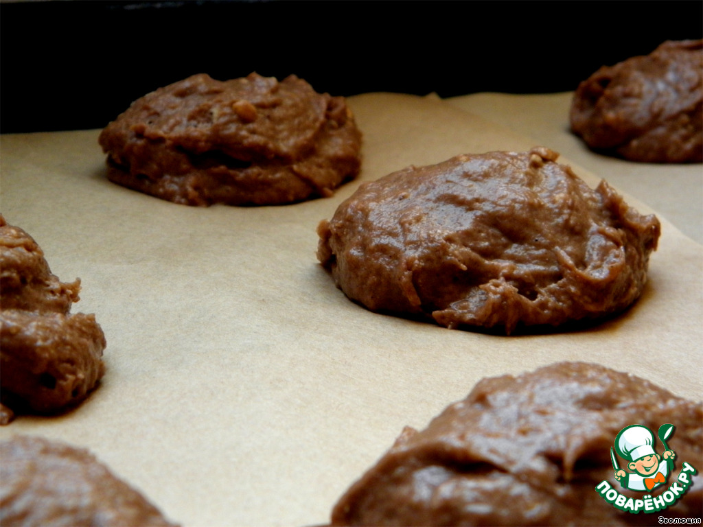 Противень застелить бумагой для выпекания. Столовой ложкой выкладывать круглые «горочки» теста. Между ними должно быть достаточно места для последующего «роста»)))) Духовка должна быть разогрета до 200С. Отправляем в нее печенье минут на 15, чтобы оно увеличилось в размерах.
