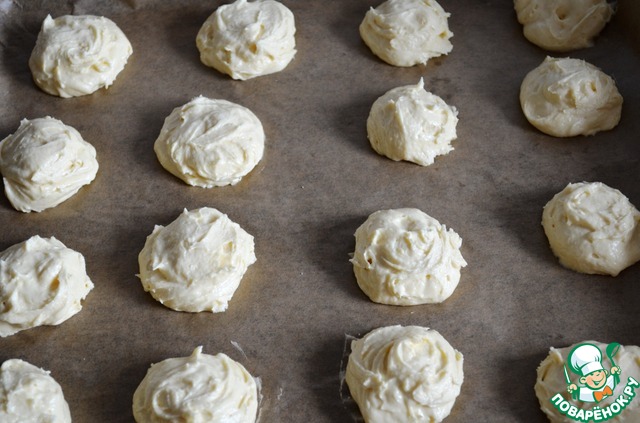 Лист застелить пергаментной бумагой! С помощью двух чайных ложечек, сделать маленькие кучки из теста. Оставлять место, для поднятия печенья.