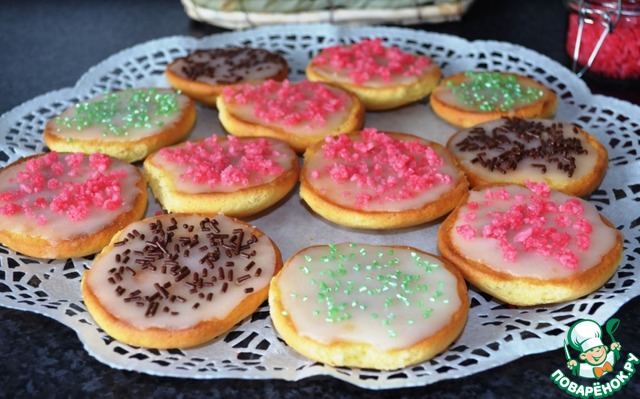 Печеньки остудить, плоскую сторону смазать глазурью, из сахарной пудры и лимонного сока. Украсить по желанию!