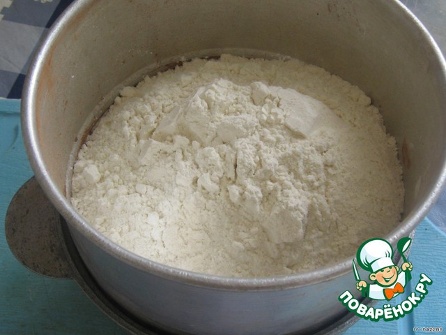 Муку с разрыхлителем просеять в массу и поставить в холодильник на пару часов. Надо, чтобы тесто хорошо застыло!