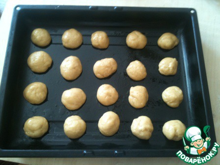 Через часик смазать наши ручки маслом, чтоб тесто не прилипало, и скатать тесто в шарики размером с грецкий орех. Противень смазать маслом и положить на него шарики, учитывая, что при выпечке наши печенюшки увеличатся в размере. Выпекать при 180*.