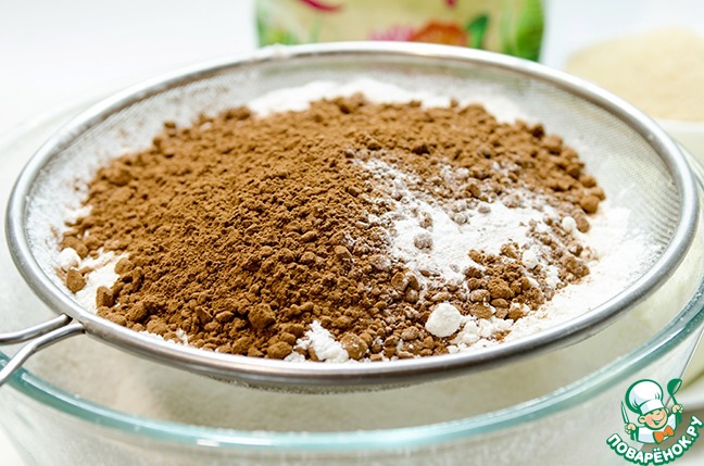 Первым делом нужно просеять муку, какао, ванилин и разрыхлитель, добавить соль.