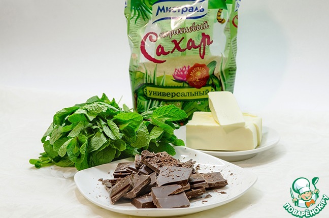 Теперь в небольшую кастрюльку кладем измельченный шоколад и ставим его на водяную баню. Постоянно помешивая, дожидаемся, когда шоколад начнет таять. Добавляем к нему сливочное масло, также продолжаем мешать. Когда содержимое небольшой кастрюльки почти растворится, выключаем огонь и продолжаем вымешать до однородности шоколадную массу. Затем все переливаем в глубокую миску. Пока шоколадная смесь остывает, взобьем в блендере мяту (только листочки) с сахаром до состояния "влажного песка". Добавляем мятную массу к шоколадной и перемешиваем.