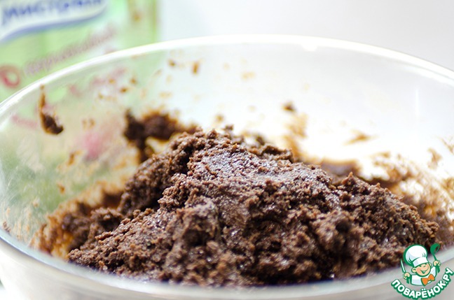 Яйца слегка взбиваем, и, убедившись, что шоколадно-мятная масса остыла - добавляем к ней яйца. Хорошо перемешиваем.