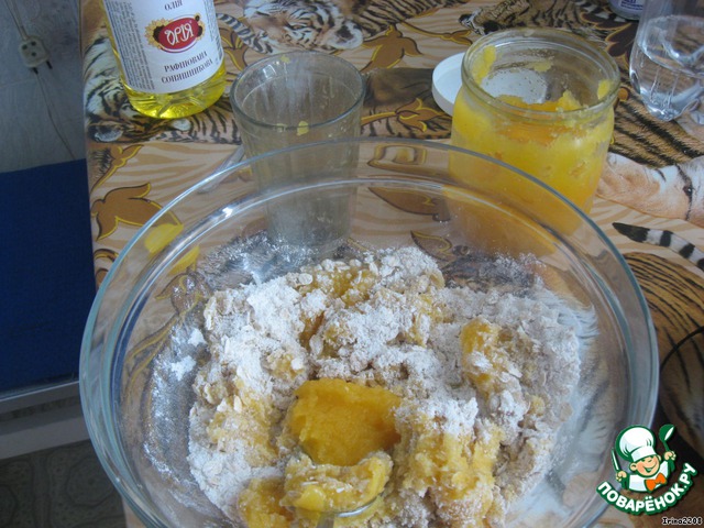 Добавить тыквенное (яблочное) пюре до получения нежной консистенции теста. У меня ушел неполный стакан тыквенного пюре, я его делала сама - взбивала печеную тыкву с добавлением воды, поэтому оно у меня нежное-нежное.