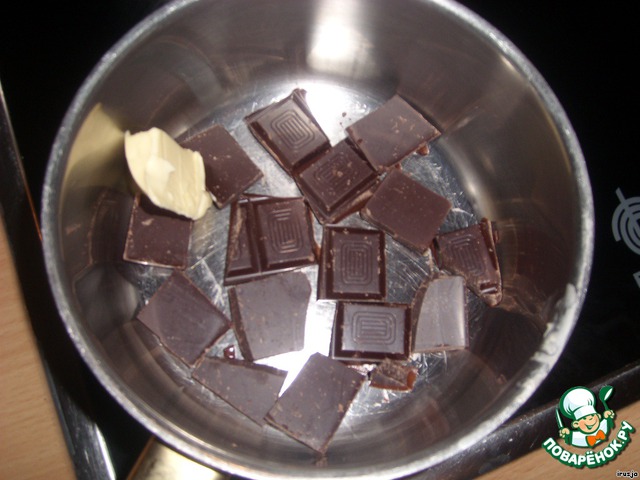 Далее берём две плитки тёмного горького шоколада, ломаем на кусочки, кладём в кастрюлю, добавляем ложечку сливочного масла и топим либо на водяной бане, либо на ооочень медленном огне.