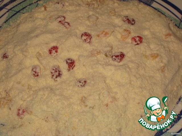 Всыпать вяленые фрукты в масляную крошку, перемешать равномерно,