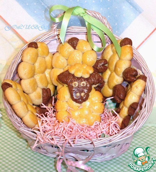 Смазываем овечек взбитым с щепоткой сахара желтком и отправляем в хорошо разогретую духовку. Выпекать в духовке при 180°С 15 минут.