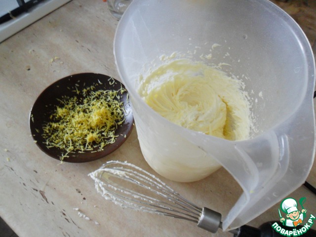 Готовить очень просто. Взбить мягкое сливочное масло и постепенно добавить в него сахарную пудру, лимонную цедру и яйцо. Взбивать нужно минуты 3.