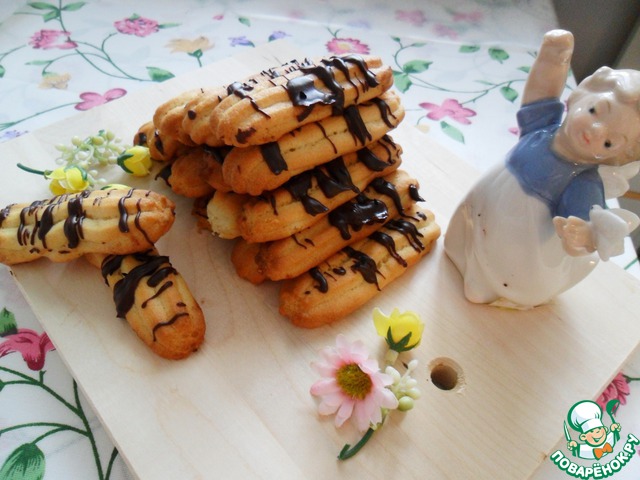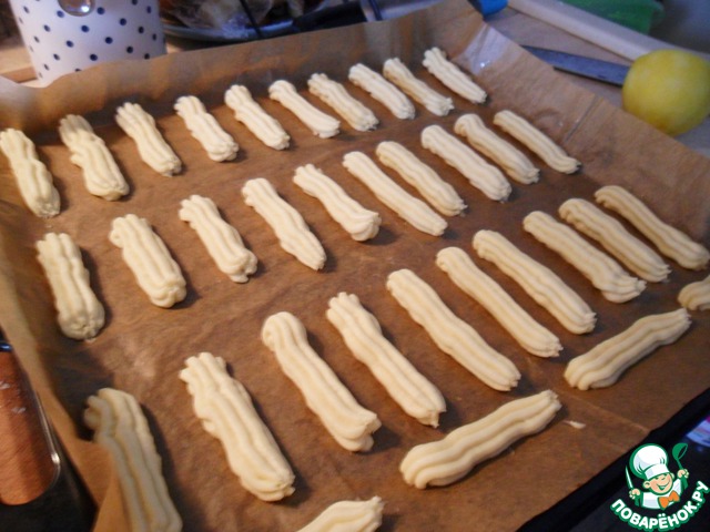 Противень застелить пекарской бумагой и отсадить наше тесто с помощью кондитерского мешка со звездчатой насадкой. Если такого мешка нет, то смочите руки в холодной воде и накатайте колбасок вручную. У меня из всего теста получилось 2 противня печенья. Выпекать 15 минут при 190-200 градусах.
