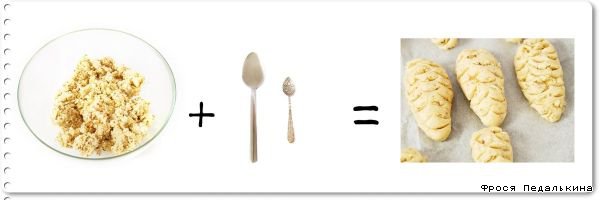 Большой ложкой сделать из теста шишку. Положить печенье на противень с пергаментом. Маленькой ложечкой нарисовать чешуйки. Выпекать при 180°С примерно 20 минут до золотистой корочки.