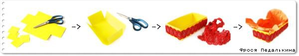 Для подарочной коробочки необходимы: картон, клей, ножницы, тесьма. С углов картона срезать одинаковые квадраты, затем согнуть полученные бока, обклеить красивой тесьмой, положить внутрь кусочек пергаментной бумаги или салфетку.
